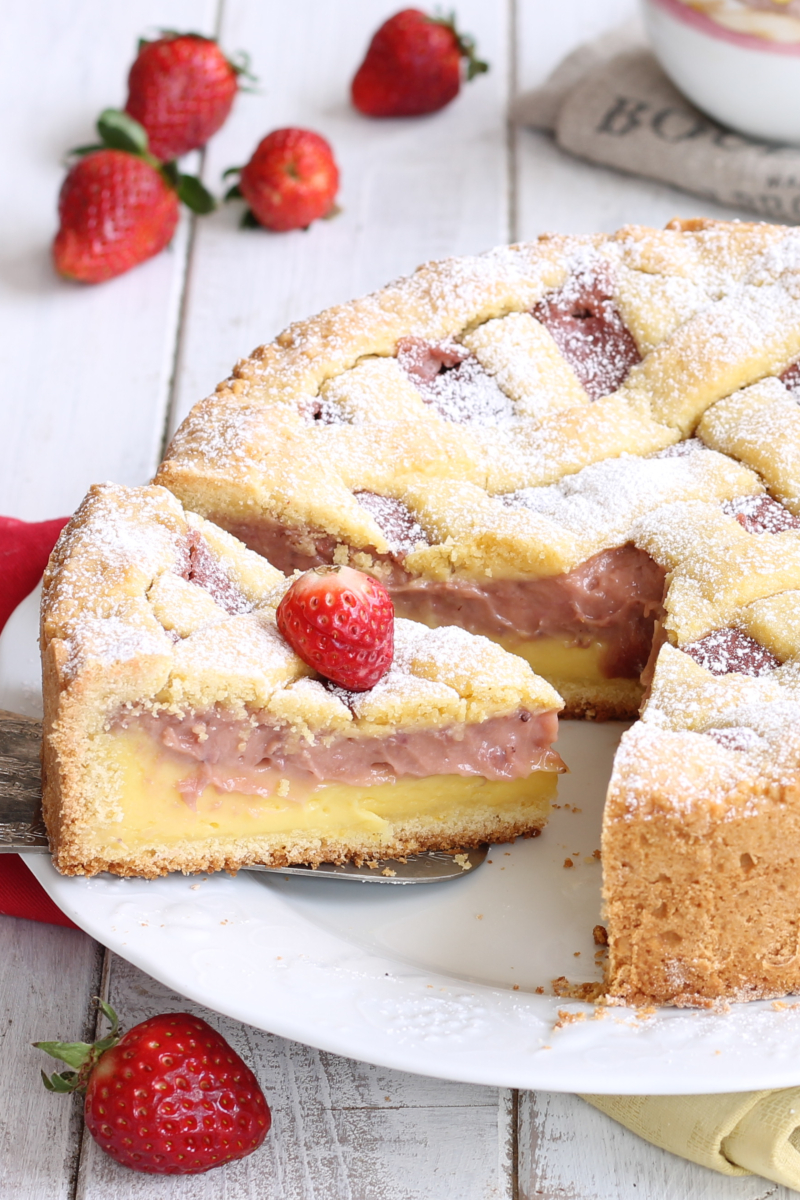 Una variante della classica crostata con fragole e crema, solo che in questo caso la crema e le fragole vanno cotte in forno insieme alla pasta frolla e non aggiunte dopo. La crostata alla crema cotta e fragole è una ricetta diversa dalle solite crostate di frutta che si preparano in due tempi: Per ogni tipo di torta esiste una pasta frolla, per ogni torta esiste una crema.
